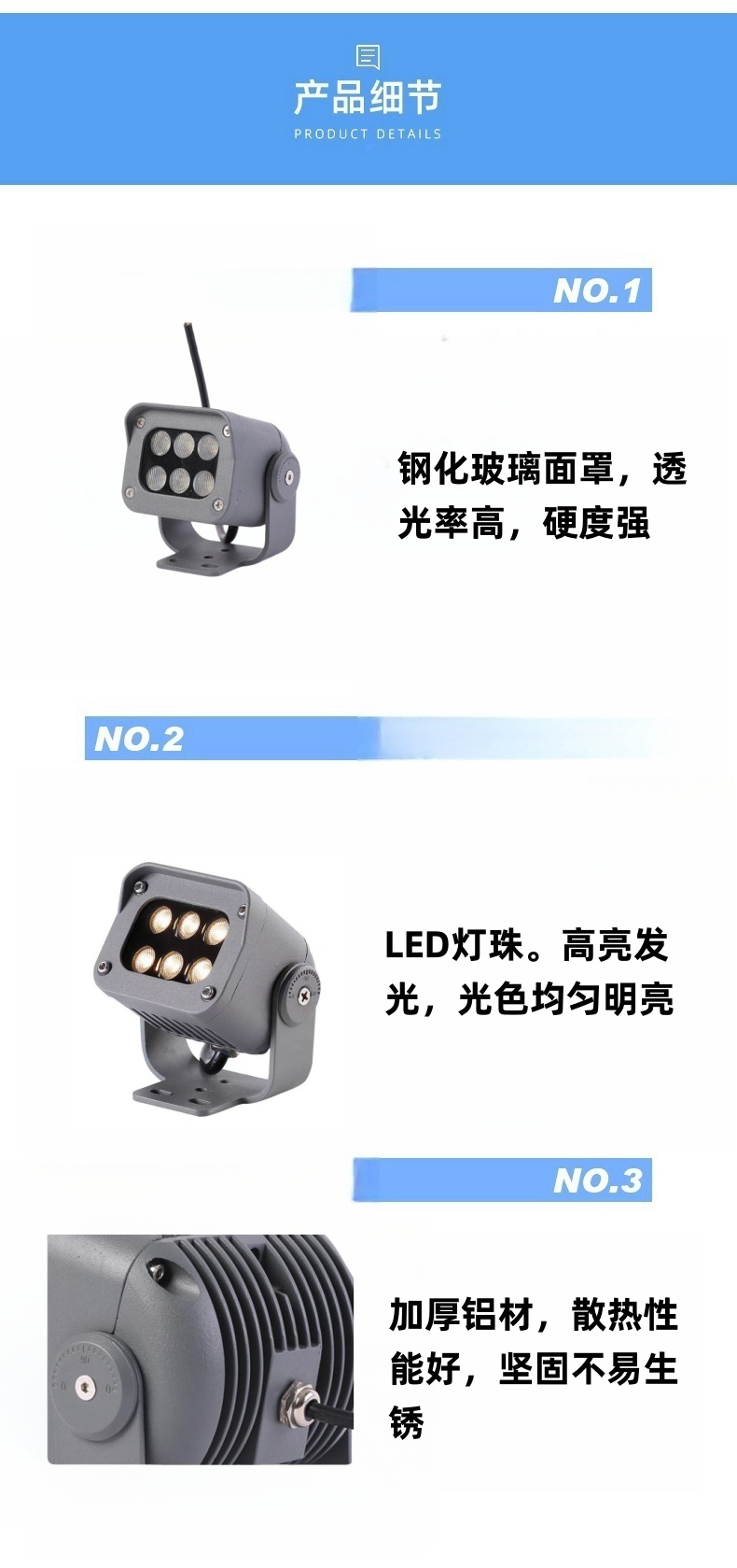 产品尺寸:66*55*70mm灯具功率:6W 灯光颜色:正白|暖白|红|黄|蓝|绿|七彩|适用场所:建筑物外观照明、景观照明、标识与指示性照明、室内空间展示照明、娱乐场所及舞台照明、视频屏幕、酒店外墙、广场夜景、园林亮化、室内装饰、户外泛光等…