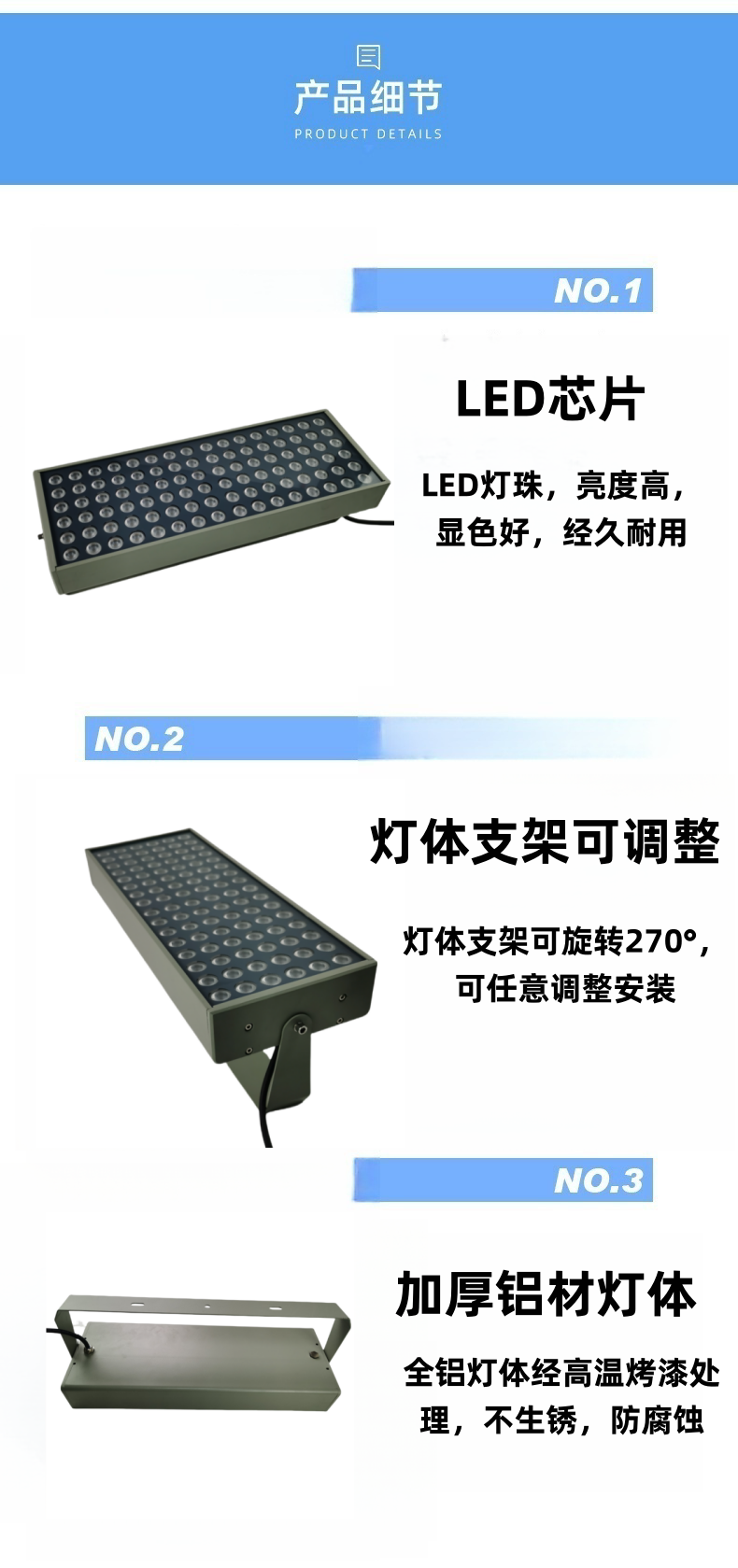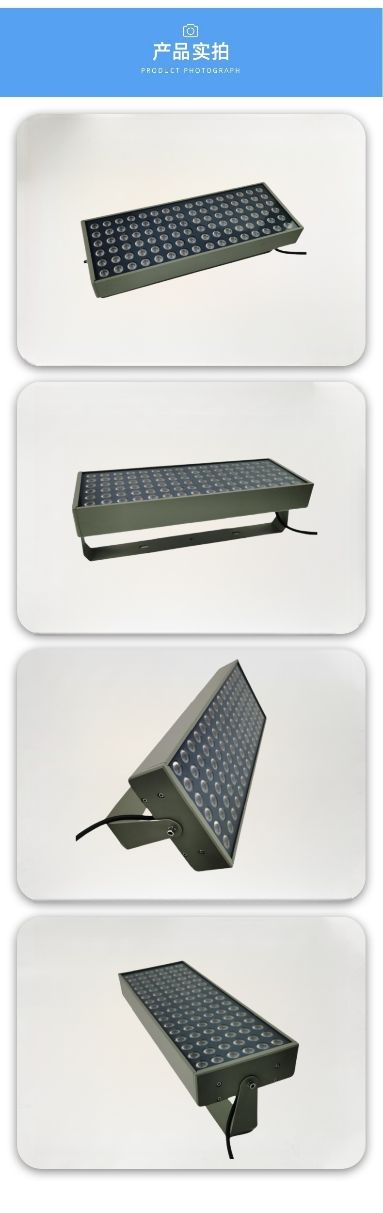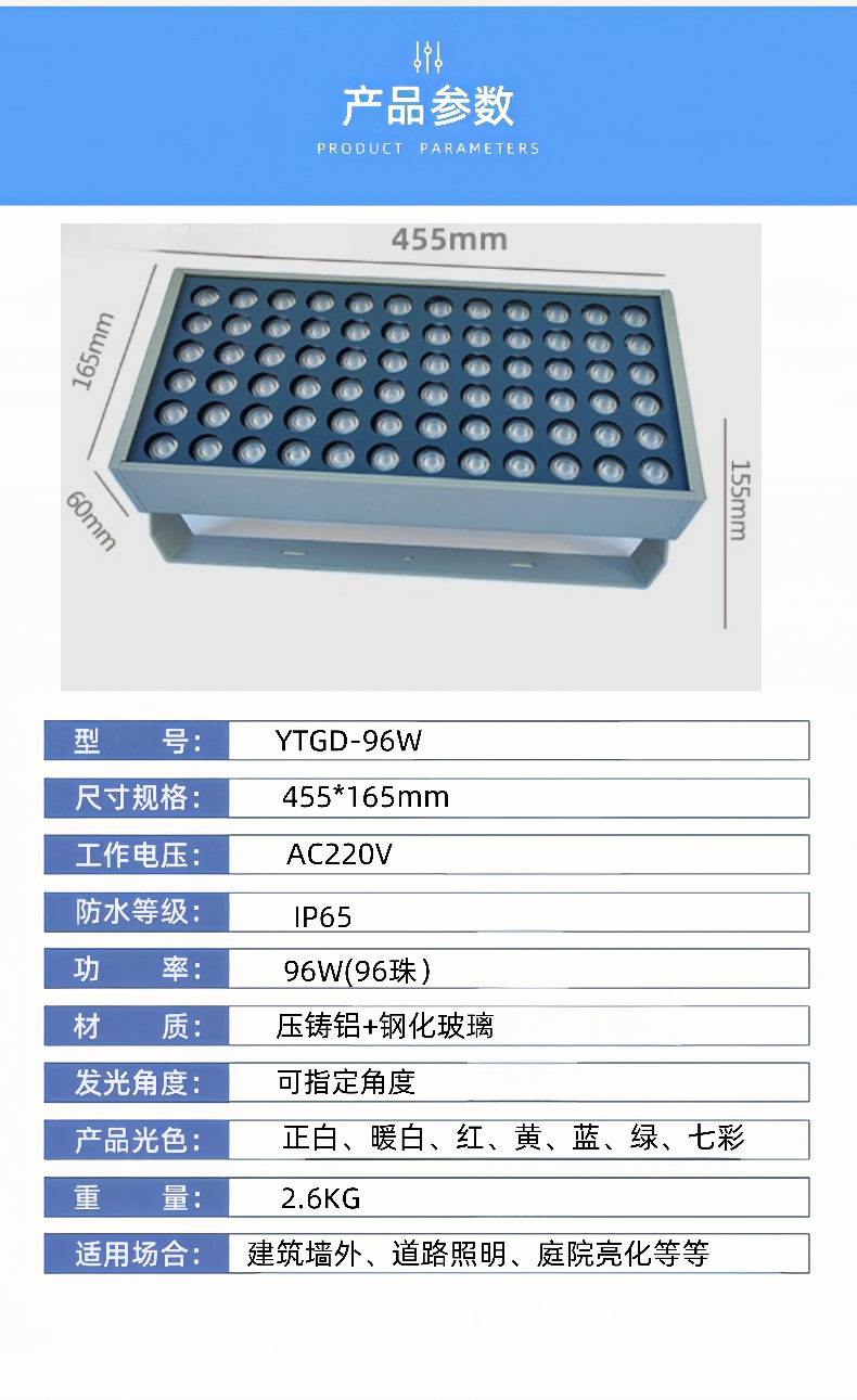 产品尺寸:455*165mm灯具功率:96W灯光颜色:正白|暖白|红|黄|蓝|绿|七彩|适用场所:建筑物外观照明、景观照明、标识与指示性照明、室内空间展示照明、娱乐场所及舞台照明、视频屏幕、酒店外墙、广场夜景、园林亮化、室内装饰、户外泛光等…