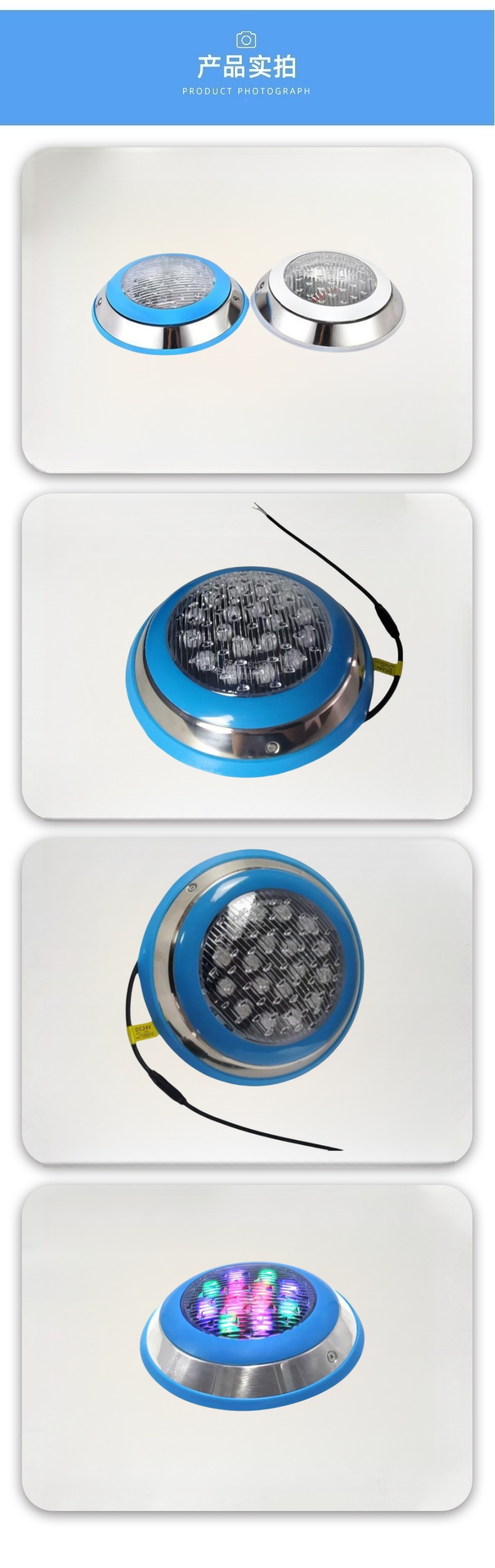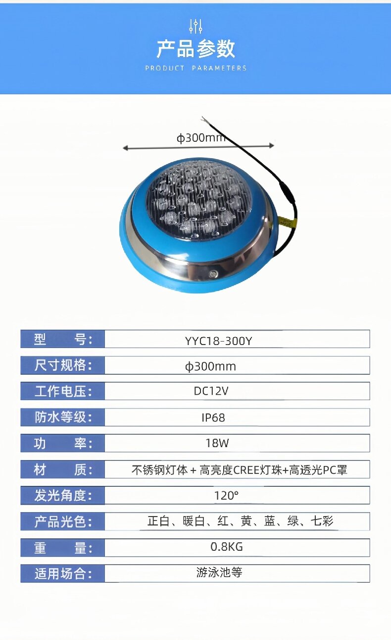 产品尺寸:直径300mm灯具功率:18W 灯光颜色:正白|暖白|红|黄|蓝|绿|七彩|适用场所:广场喷泉、水池、水底、泳池等水底亮化…