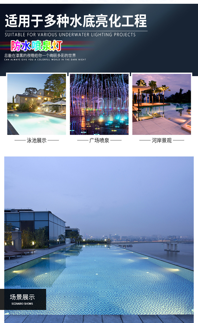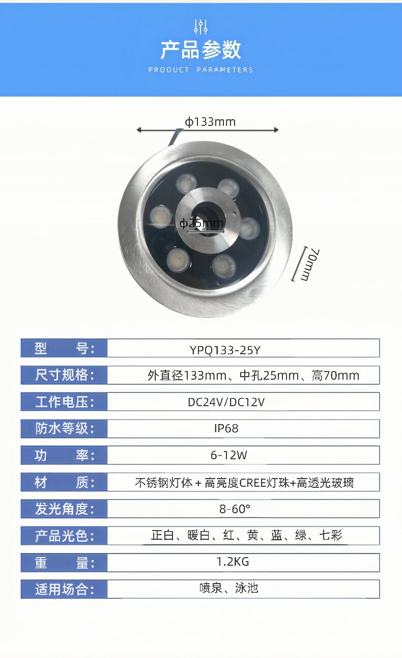产品尺寸:Φ133*H70MM灯具功率:6W灯光颜色:正白|暖白|红|黄|蓝|绿|七彩|适用场所:广场喷泉、水池、水底、泳池等水底亮化…