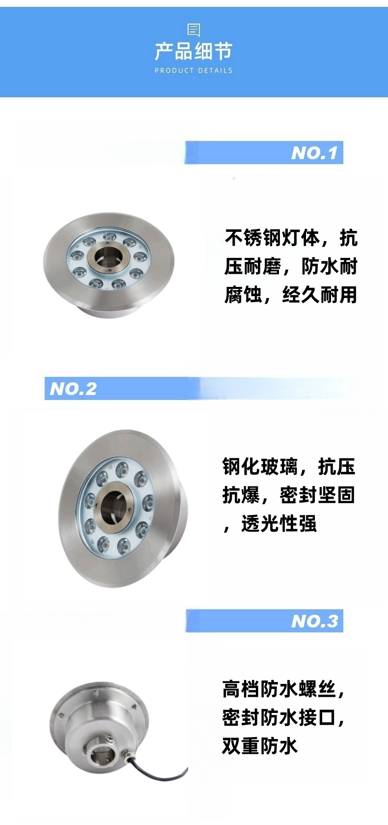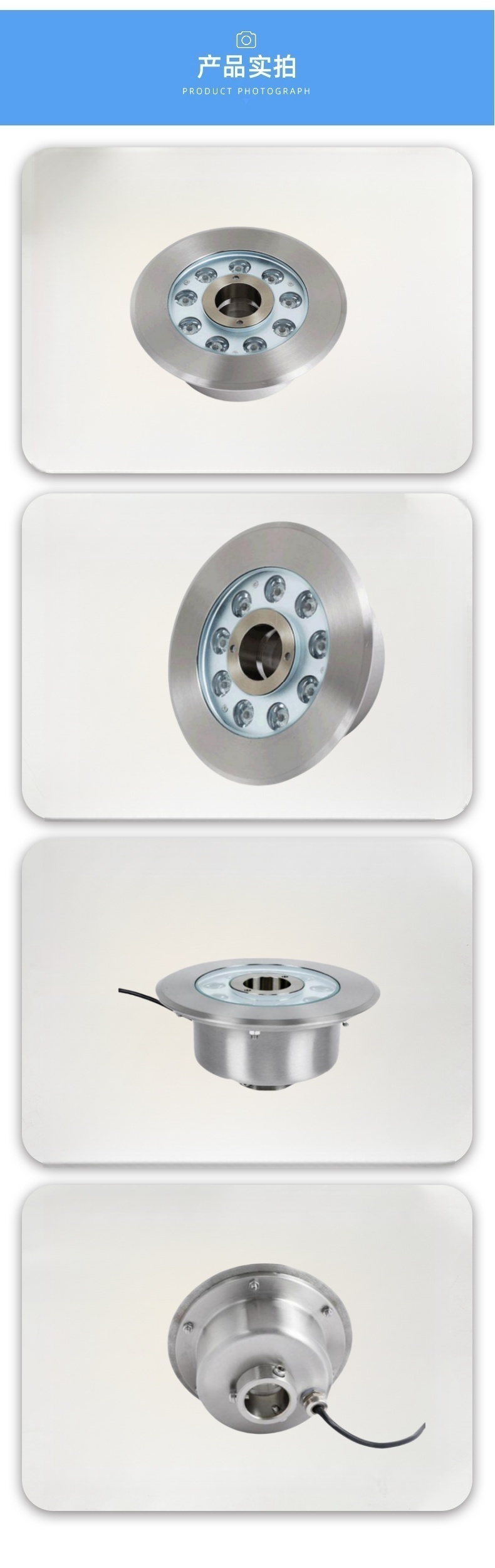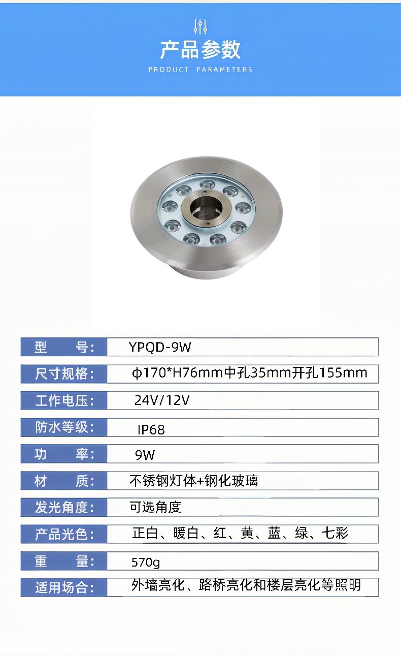 产品尺寸:φ170*H76mm中孔35mm开孔155mm灯具功率:9W 灯光颜色:正白|暖白|红|黄|蓝|绿|七彩|适用场所:广场喷泉、水池、水底、泳池等水底亮化…