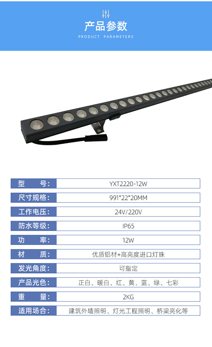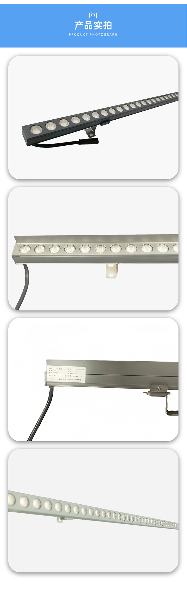 产品尺寸:1000*22*20mm灯具功率:12W灯光颜色:正白|暖白|红|黄|蓝|绿|七彩|适用场所:1、楼体墙面、窗台 2、桥梁两侧、桥洞 3、河道、河提、围栏、广场浮雕 4、古建筑、走廊过道…