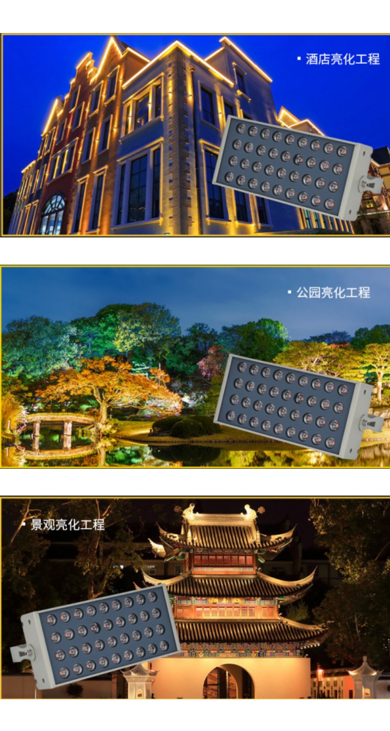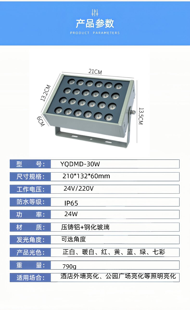 产品尺寸:210*132*60mm (详情请咨询)灯具功率:24W/36W/48W灯光颜色:正白|暖白|红|黄|蓝|绿|七彩|适用场所:建筑物外观照明、景观照明、标识与指示性照明、室内空间展示照明、娱乐场所及舞台照明、视频屏幕、酒店外墙、广场夜景、园林亮化、室内装饰、户外泛光等…