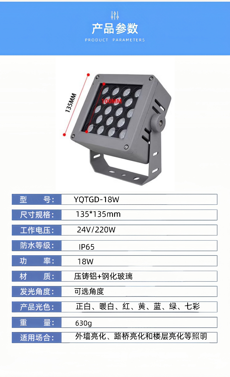 产品尺寸:135*135mm灯具功率:18W灯光颜色:正白|暖白|红|黄|蓝|绿|适用场所:建筑物外观照明、景观照明、标识与指示性照明、室内空间展示照明、娱乐场所及舞台照明、视频屏幕、酒店外墙、广场夜景、园林亮化、室内装饰、户外泛光等…