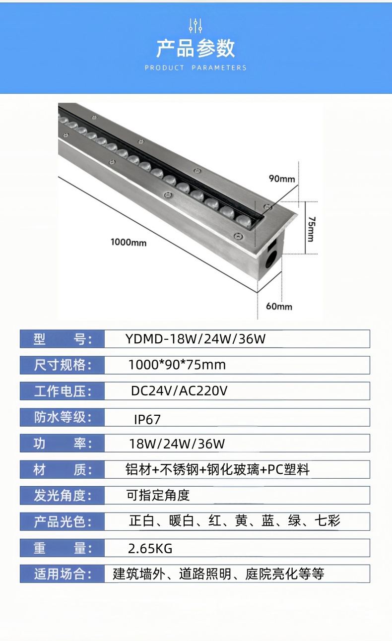 产品尺寸:1000*90*75mm(详情可咨询)灯具功率:18W/24W/36W灯光颜色:正白|暖白|红|黄|蓝|绿|七彩|适用场所:广泛用于广场、户外公园、休闲场所等户外照明,以及公园绿化、草坪、广场、庭院、花坛、步行街装饰,瀑布、喷泉水底等场所夜景照明厂家…