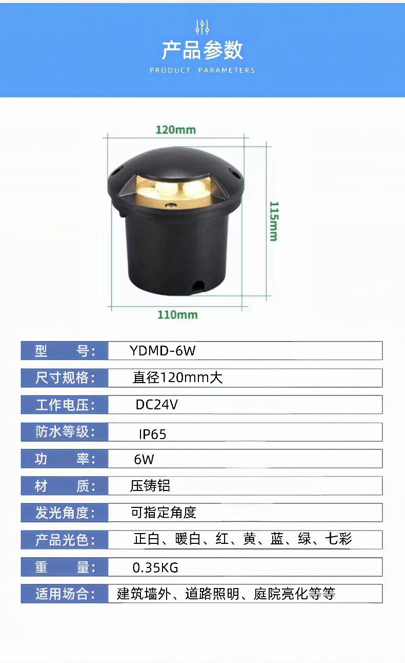 产品尺寸:直径120*H115mm灯具功率:6W灯光颜色:正白|暖白|红|黄|蓝|绿|七彩|适用场所:广泛用于广场、户外公园、休闲场所等户外照明,以及公园绿化、草坪、广场、庭院、花坛、步行街装饰,瀑布、喷泉水底等场所夜景照明亮化…