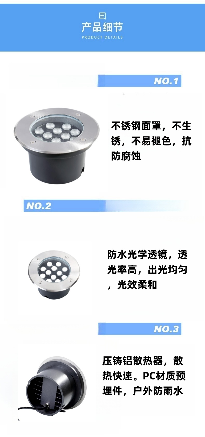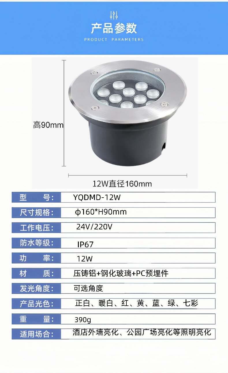 产品尺寸:直径160*H90mm灯具功率:12W灯光颜色:正白|暖白|红|黄|蓝|绿|七彩|适用场所:广泛用于广场、户外公园、休闲场所等户外照明,以及公园绿化、草坪、广场、庭院、花坛、步行街装饰,瀑布、喷泉水底等场所夜景照明��…