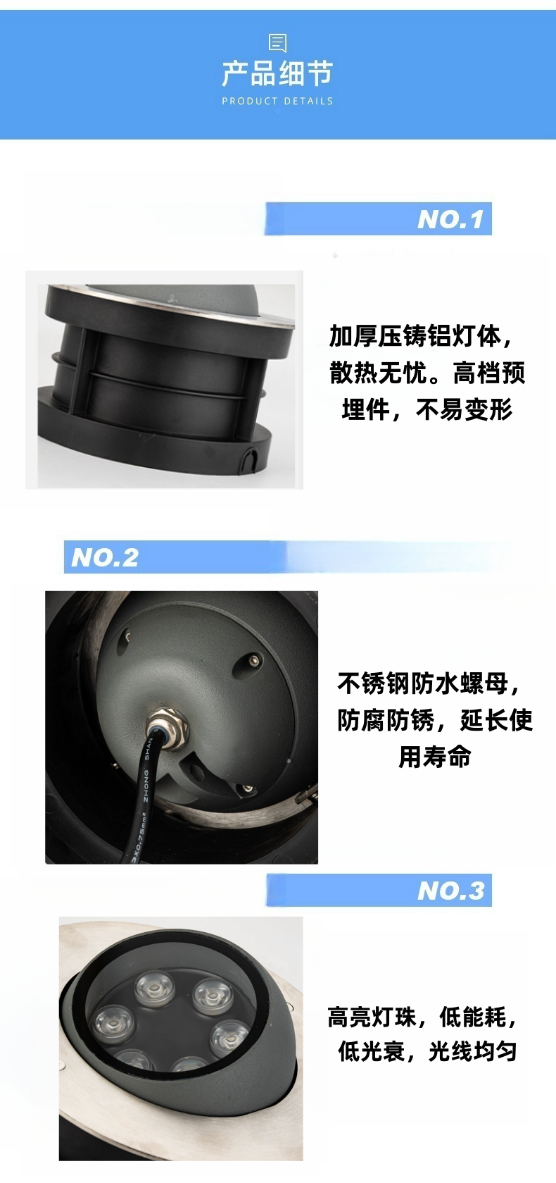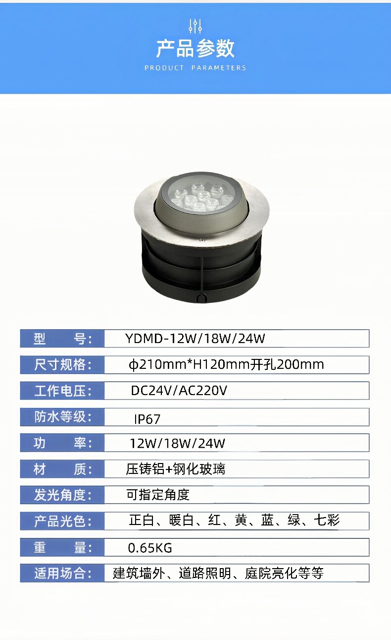 产品尺寸:直径210*H120mm灯具功率:12W|18W|24W灯光颜色:正白|暖白|红|黄|蓝|绿|七彩|适用场所:广泛用于广场、户外公园、休闲场所等户外照明,以及公园绿化、草坪、广场、庭院、花坛、步行街装饰,瀑布、喷泉水底等场所夜景照明亮化…
