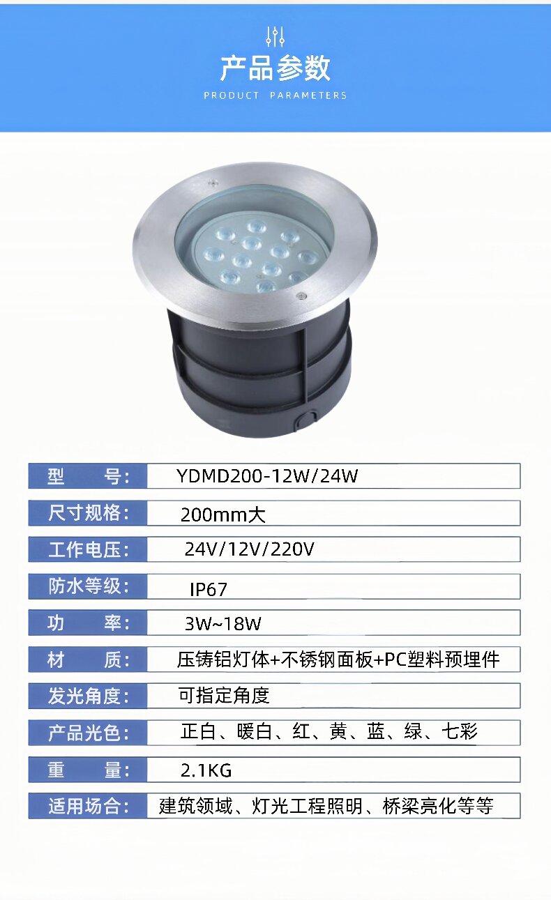 产品尺寸:直径200mm灯具功率:12W~24W灯光颜色:正白|暖白|红|黄|蓝|绿|适用场所:广泛用于广场、户外公园、休闲场所等户外照明,以及公园绿化、草坪、广场、庭院、花坛、步行街装饰,瀑布、喷泉水底等场所夜景照明亮化…