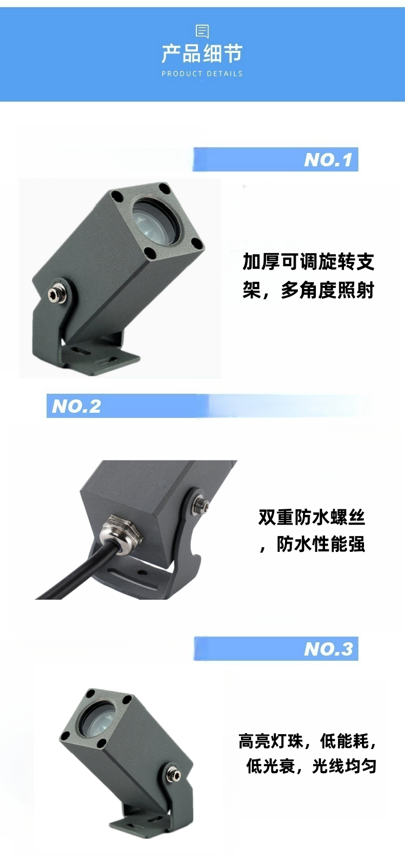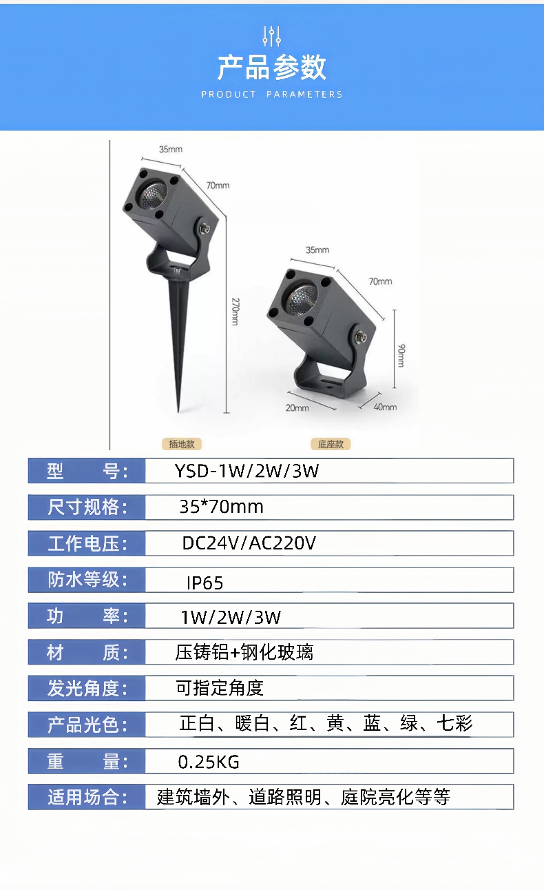 产品尺寸:Φ35*H70mm灯具功率:3W灯光颜色:正白|暖白|红|黄|蓝|绿|七彩|(5W只做单色)适用场所:建筑物外观照明、景观照明、标识与指示性照明、室内空间展示照明、娱乐场所及舞台照明、视频屏幕、酒店外墙、广场夜景、园林亮化、室内装饰、户外泛光等…