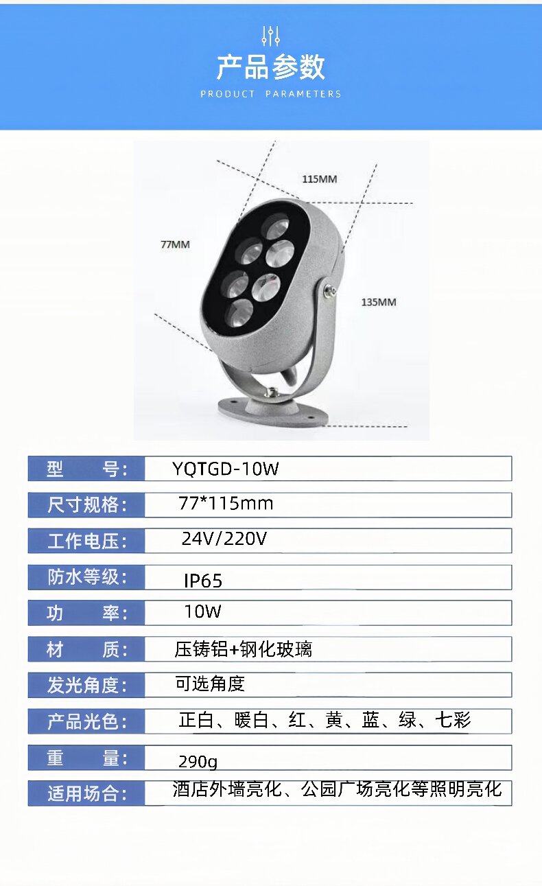 产品尺寸:77*115mm灯具功率:10W灯光颜色:正白|暖白|红|黄|蓝|绿|七彩适用场所:建筑物外观照明、景观照明、标识与指示性照明、室内空间展示照明、娱乐场所及舞台照明、视频屏幕、酒店外墙、广场夜景、园林亮化、室内装饰、户外泛光等…