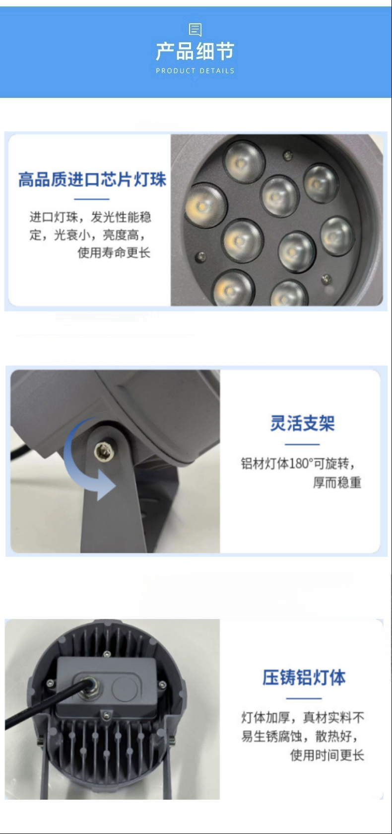 产品尺寸:Φ125*H155mm(详情请咨询)灯具功率:9W灯光颜色:正白|暖白|红|黄|蓝|绿|七彩适用场所:建筑物外观照明、景观照明、标识与指示性照明、室内空间展示照明、娱乐场所及舞台照明、视频屏幕、酒店外墙、广场夜景、园林亮化、室内装饰、户外泛光等…