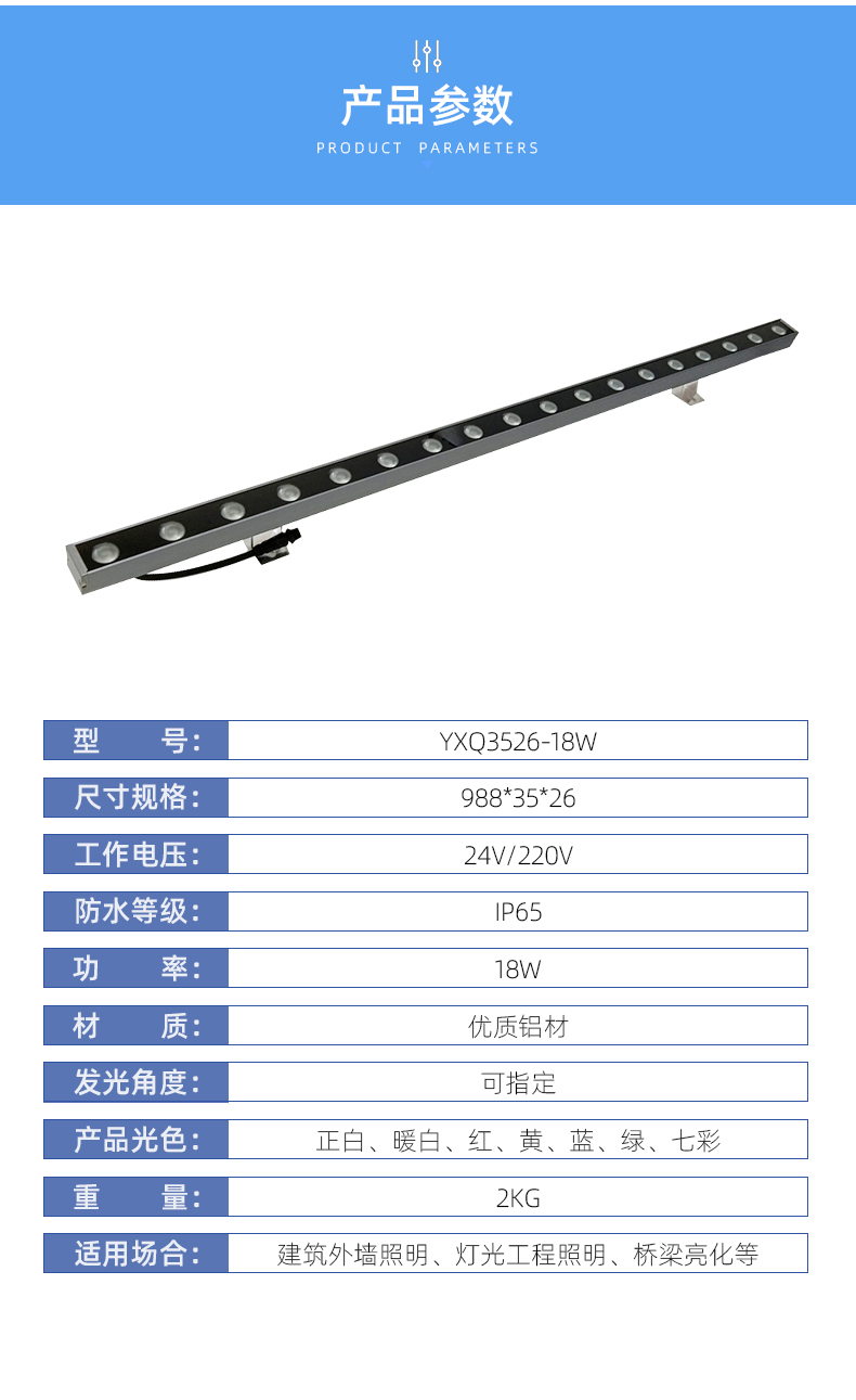 产品尺寸:1000*35*26mm灯具功率:18W灯光颜色:正白|暖白|红|黄|蓝|绿|七彩|适用场所:1、楼体墙面、窗台 2、桥梁两侧、桥洞 3、河道、河提、围栏、广场浮雕 4、古建筑、走廊过道…