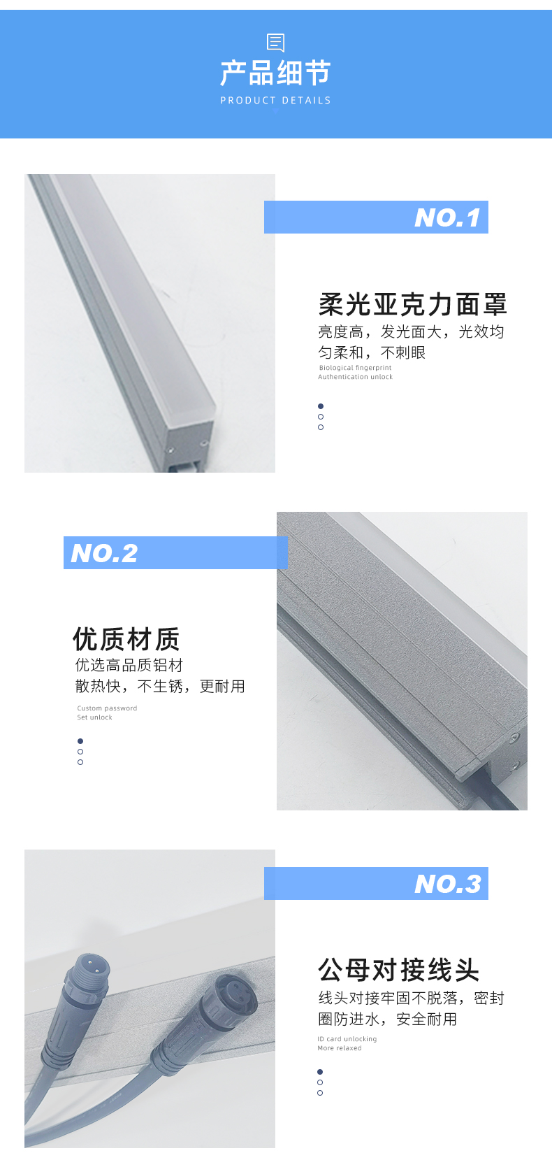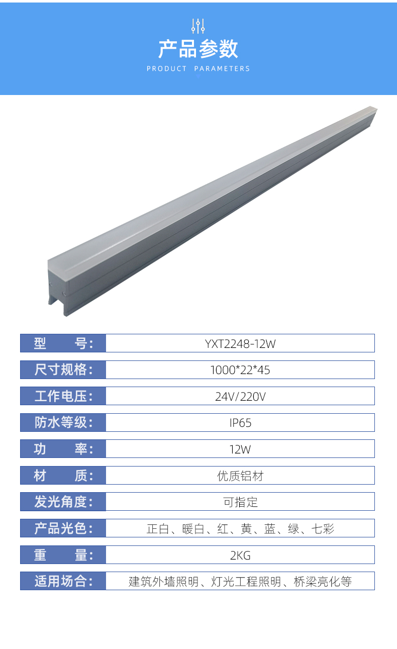 产品尺寸:产品尺寸:1000*22*45mm灯具功率:12W灯光颜色:正白|暖白|红|黄|蓝|绿|七彩|适用场所:1、楼体墙面、窗台 2、桥梁两侧、桥洞 3、河道、河提、围栏、广场浮雕 4、古建筑、走廊过道…