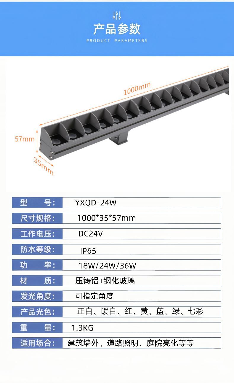 产品尺寸:1000*35*57mm灯具功率:24W灯光颜色:正白|暖白|红|黄|蓝|绿|七彩|适用场所:广泛用于广场、户外公园、休闲场所等户外照明,以及公园绿化、草坪、广场、庭院、花坛、步行街装饰,瀑布、喷泉水底等场所夜景照明厂家…