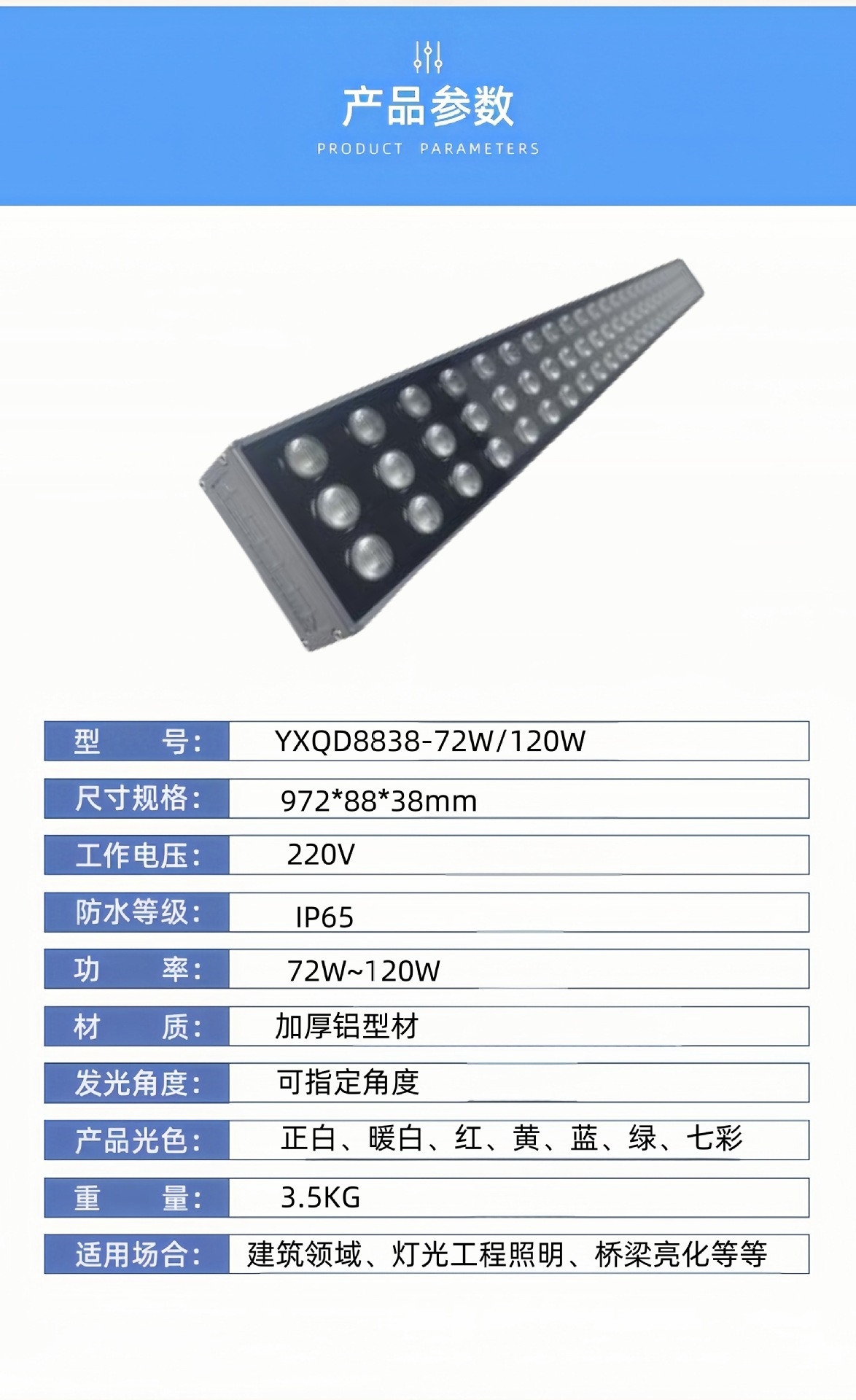 产品尺寸:972*88*38mm灯具功率:120W灯光颜色:正白|暖白|红|黄|蓝|绿|七彩|适用场所:广泛用于广场、户外公园、休闲场所等户外照明,以及公园绿化、草坪、广场、庭院、花坛、步行街装饰,瀑布、喷泉水底等场所夜景照明厂家…