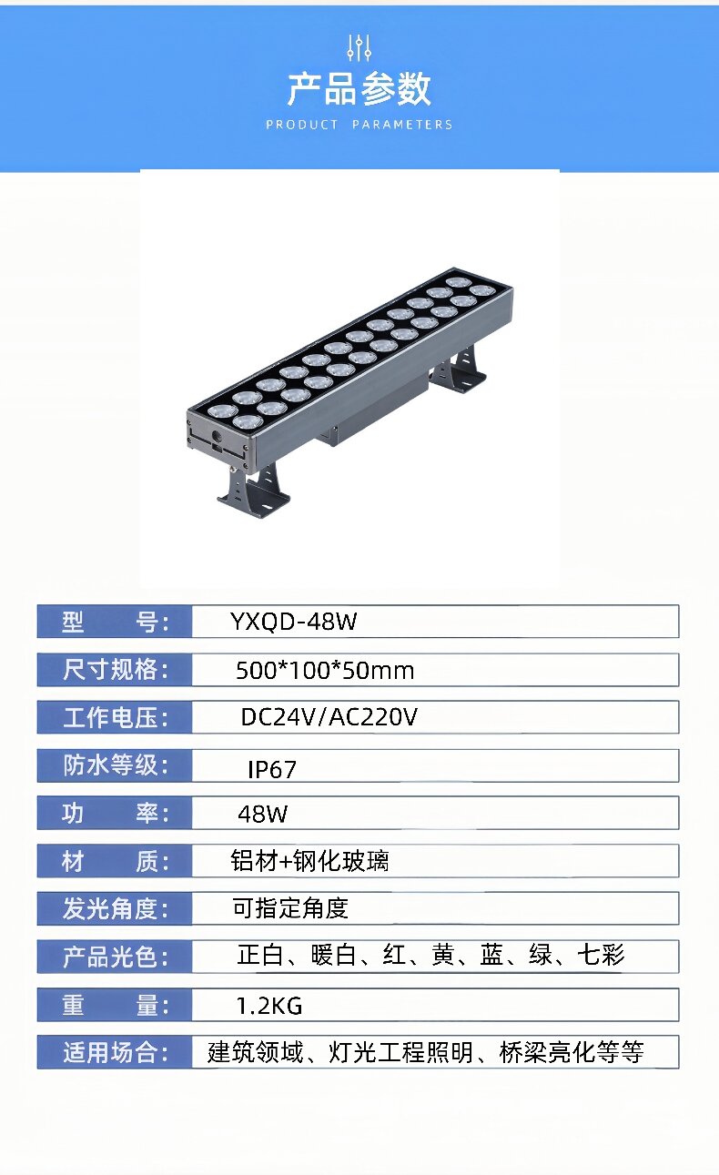 产品尺寸:500*100*50mm灯具功率:48W灯光颜色:正白|暖白|红|黄|蓝|绿|七彩|适用场所:广泛用于广场、户外公园、休闲场所等户外照明,以及公园绿化、草坪、广场、庭院、花坛、步行街装饰,瀑布、喷泉水底等场所夜景照明厂家…