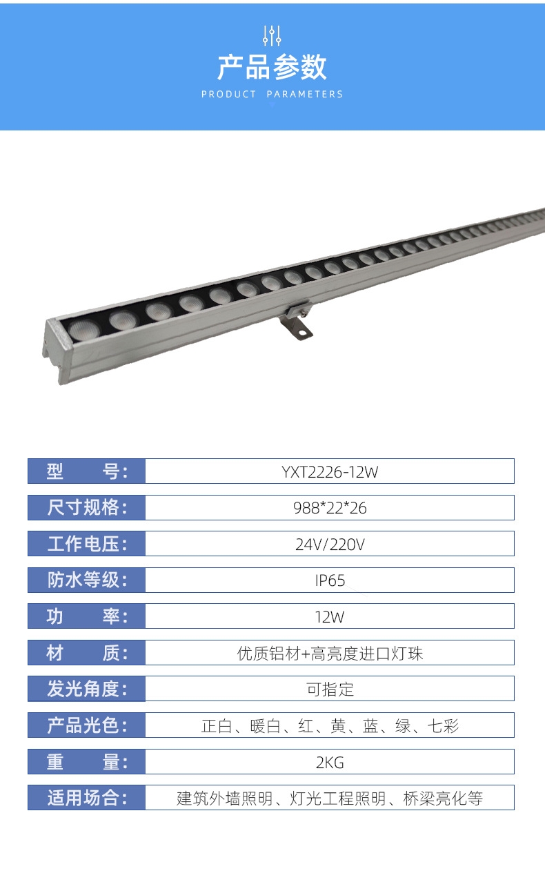 产品尺寸:1000*22*26mm灯具功率:12W灯光颜色:正白|暖白|红|黄|蓝|绿|七彩|适用场所:广泛用于广场、户外公园、休闲场所等户外照明,以及公园绿化、草坪、广场、庭院、花坛、步行街装饰,瀑布、喷泉水底等场所夜景照明亮化…